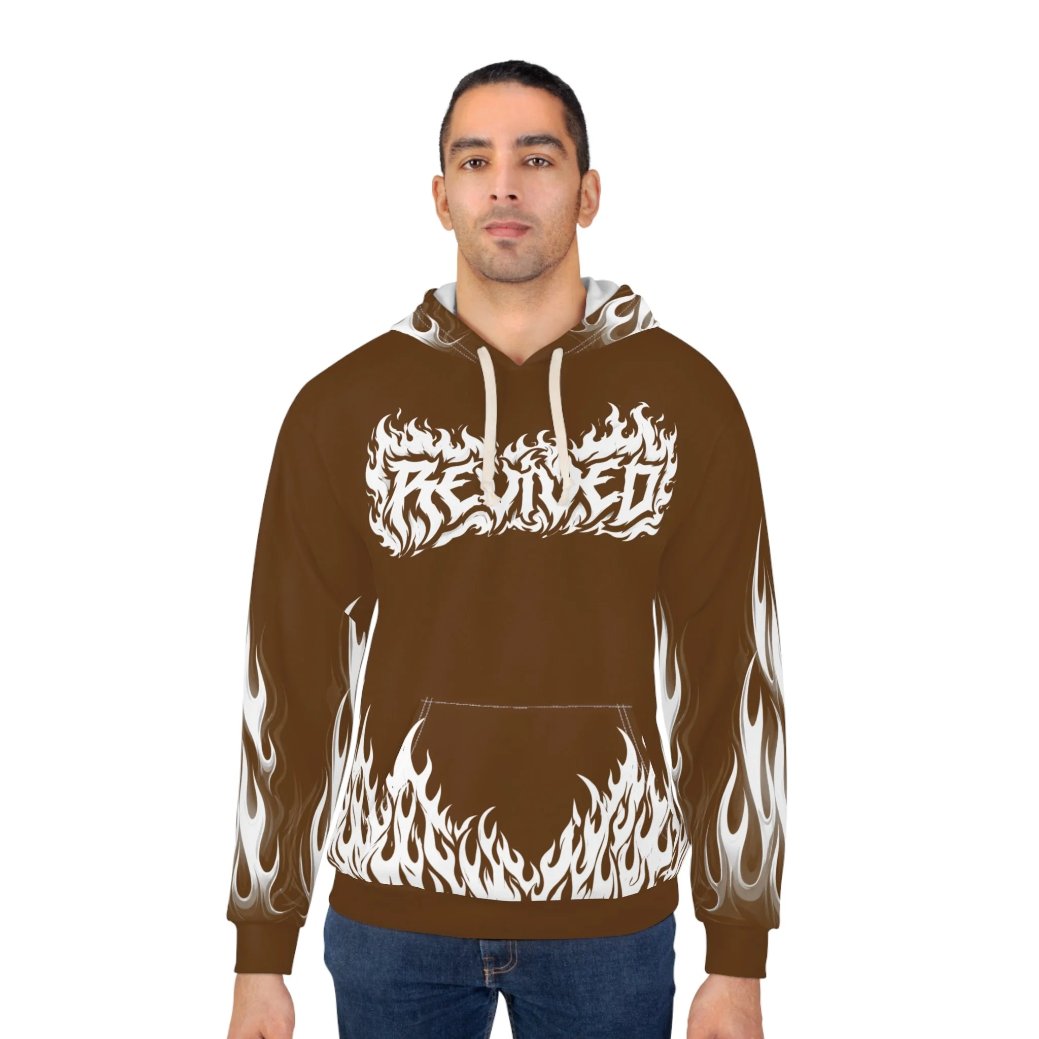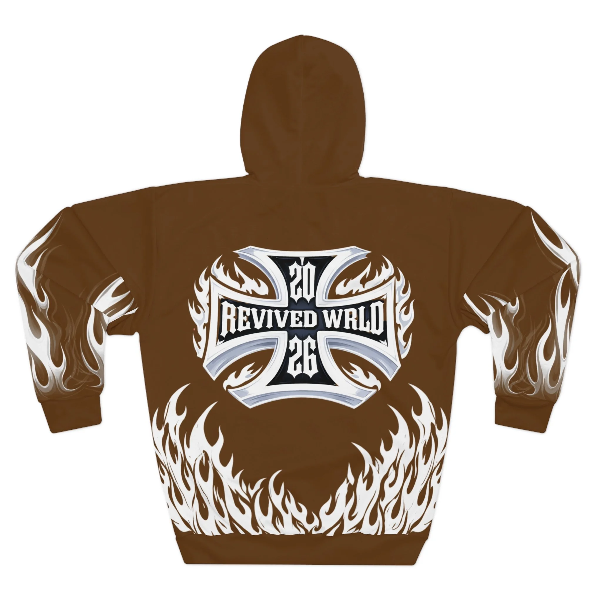This hoodie channels raw energy and night-street attitude. Heavy black fabric serves as the backdrop for white, tattoo-style flames licking the hem and sleeves, while a distressed, gothic wordmark sits across the chest. The back carries a bold iron-cross motif with stylized lettering, giving the piece an underground, biker-meets-metal vibe. Wear it when you want to bring heat to late rides, show up at underground shows, or layer for chilly nights out with friends. The roomy kangaroo pocket and adjustable hood keep it practical; the all-over print keeps it loud. It feels lived-in from the first pull-over — familiar, fierce, and ready to become part of your nightly rotation.