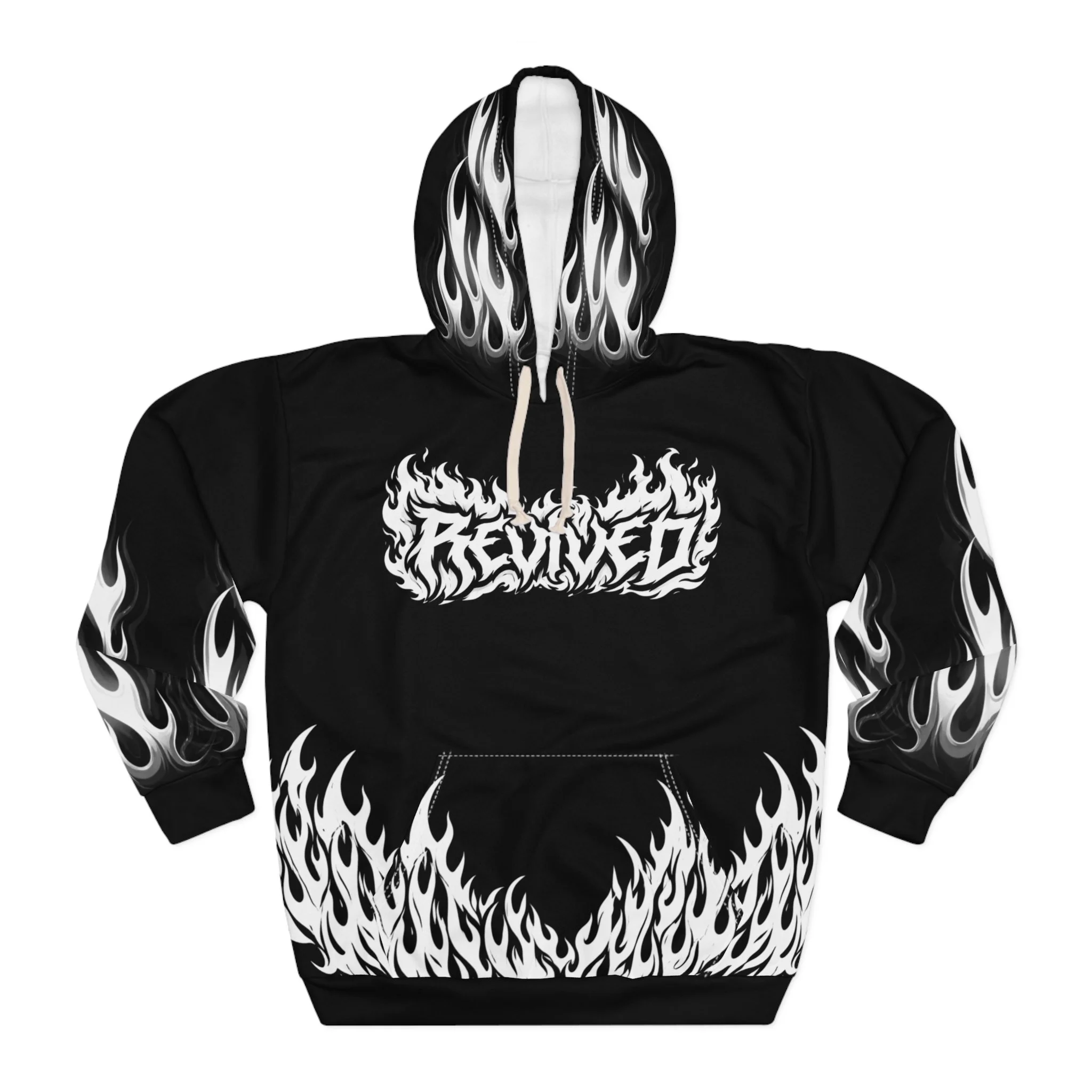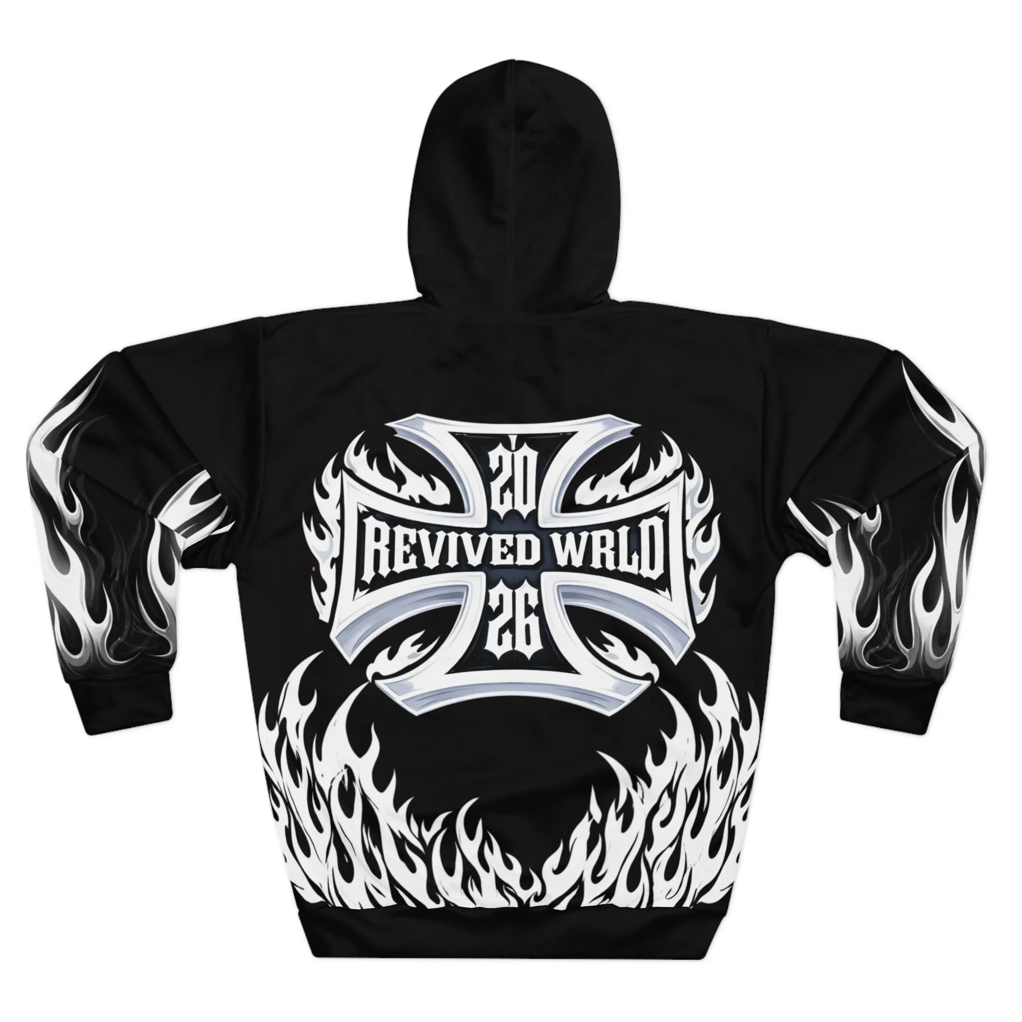 This hoodie channels raw energy and night-street attitude. Heavy black fabric serves as the backdrop for white, tattoo-style flames licking the hem and sleeves, while a distressed, gothic wordmark sits across the chest. The back carries a bold iron-cross motif with stylized lettering, giving the piece an underground, biker-meets-metal vibe. Wear it when you want to bring heat to late rides, show up at underground shows, or layer for chilly nights out with friends. The roomy kangaroo pocket and adjustable hood keep it practical; the all-over print keeps it loud. It feels lived-in from the first pull-over — familiar, fierce, and ready to become part of your nightly rotation.