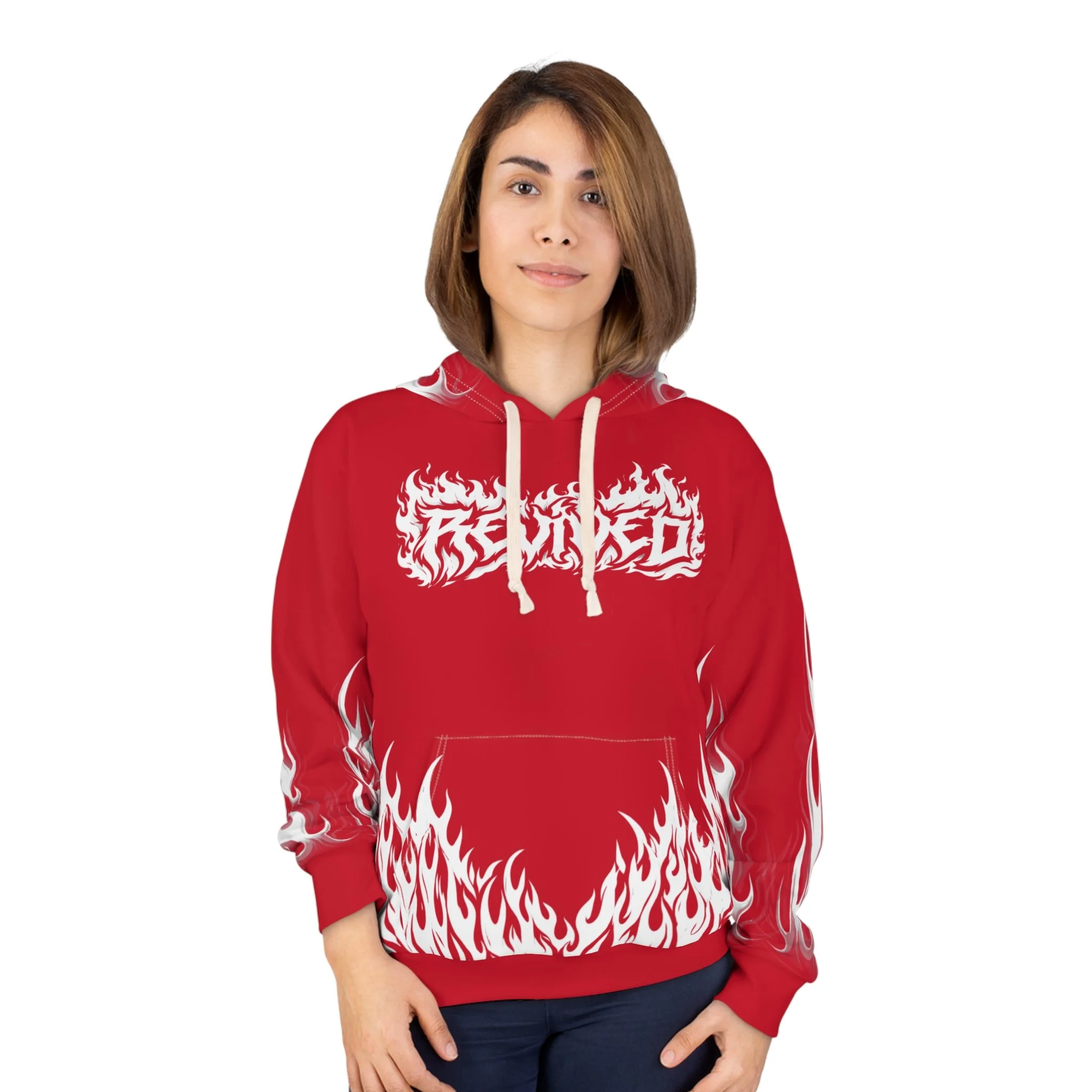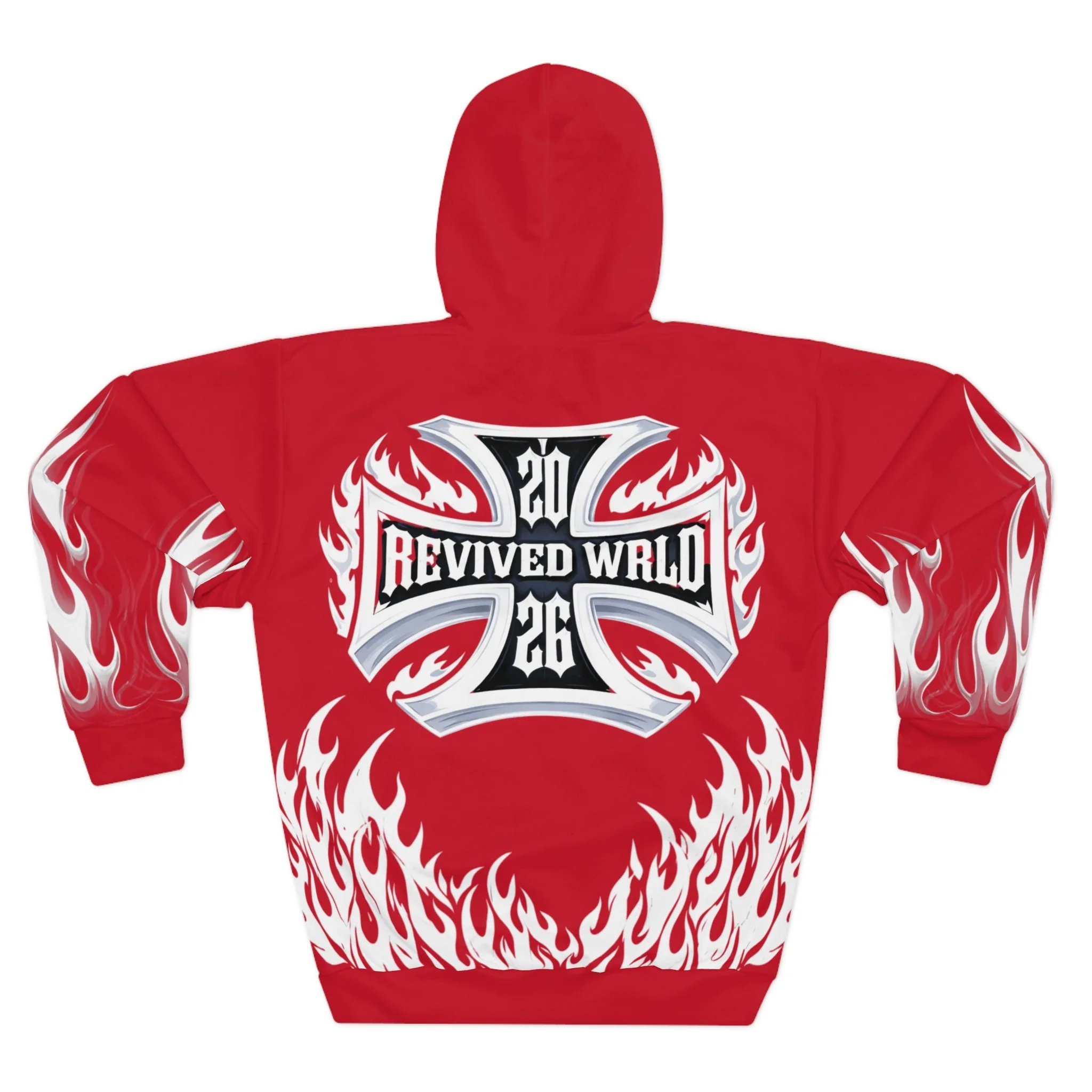 This hoodie channels raw energy and night-street attitude. Heavy black fabric serves as the backdrop for white, tattoo-style flames licking the hem and sleeves, while a distressed, gothic wordmark sits across the chest. The back carries a bold iron-cross motif with stylized lettering, giving the piece an underground, biker-meets-metal vibe. Wear it when you want to bring heat to late rides, show up at underground shows, or layer for chilly nights out with friends. The roomy kangaroo pocket and adjustable hood keep it practical; the all-over print keeps it loud. It feels lived-in from the first pull-over — familiar, fierce, and ready to become part of your nightly rotation.