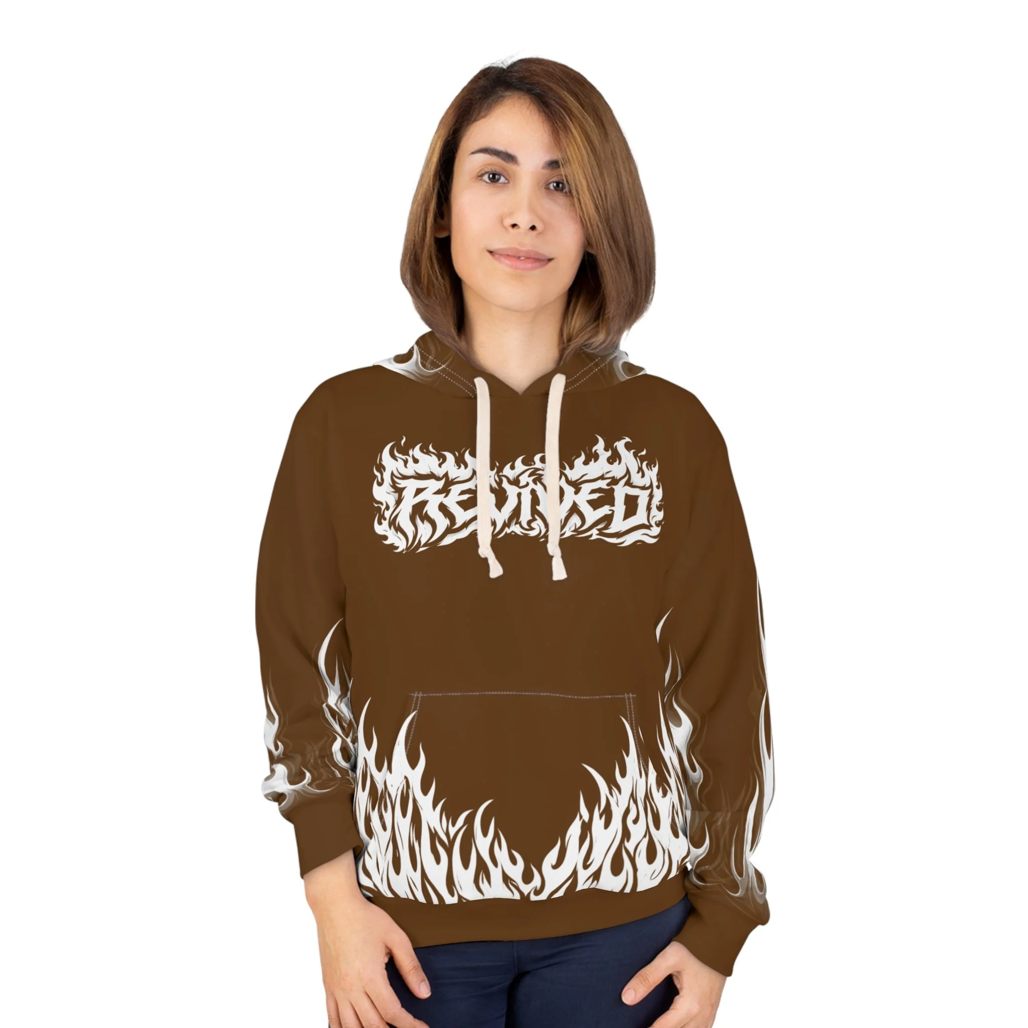 This hoodie channels raw energy and night-street attitude. Heavy black fabric serves as the backdrop for white, tattoo-style flames licking the hem and sleeves, while a distressed, gothic wordmark sits across the chest. The back carries a bold iron-cross motif with stylized lettering, giving the piece an underground, biker-meets-metal vibe. Wear it when you want to bring heat to late rides, show up at underground shows, or layer for chilly nights out with friends. The roomy kangaroo pocket and adjustable hood keep it practical; the all-over print keeps it loud. It feels lived-in from the first pull-over — familiar, fierce, and ready to become part of your nightly rotation.
