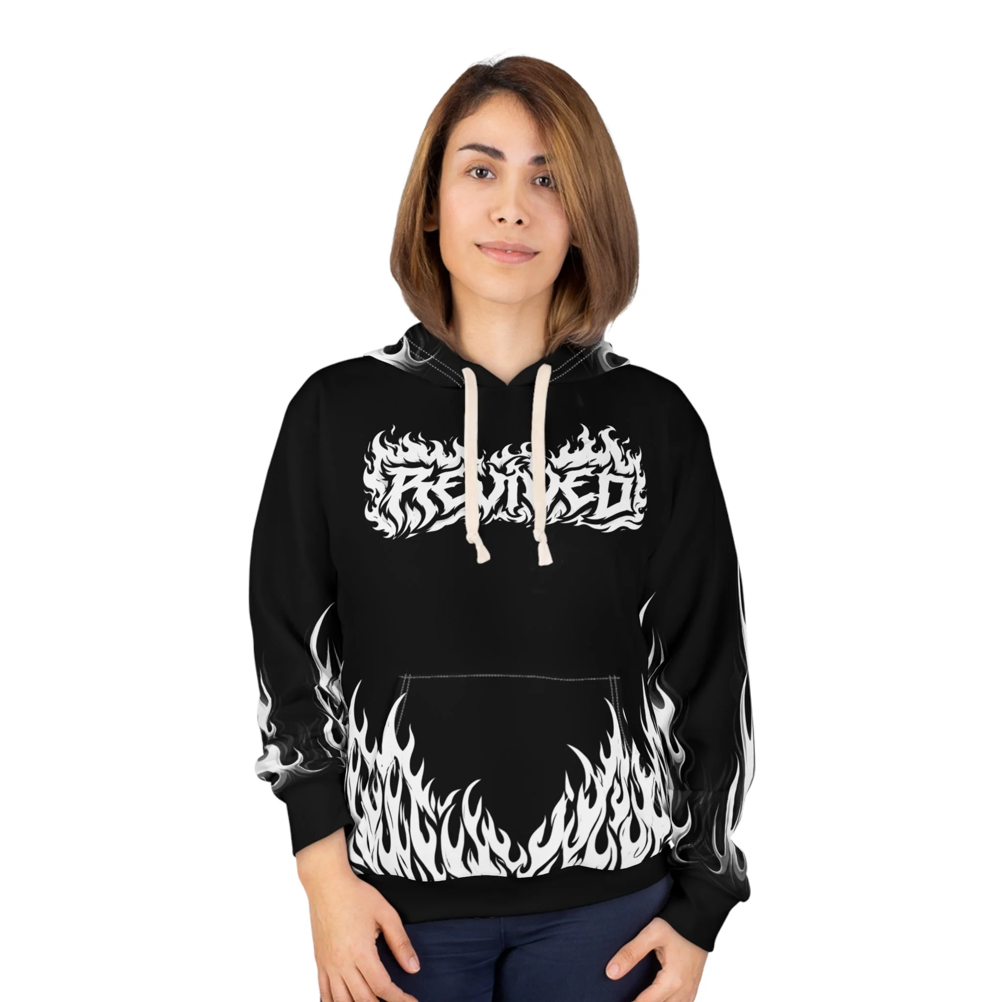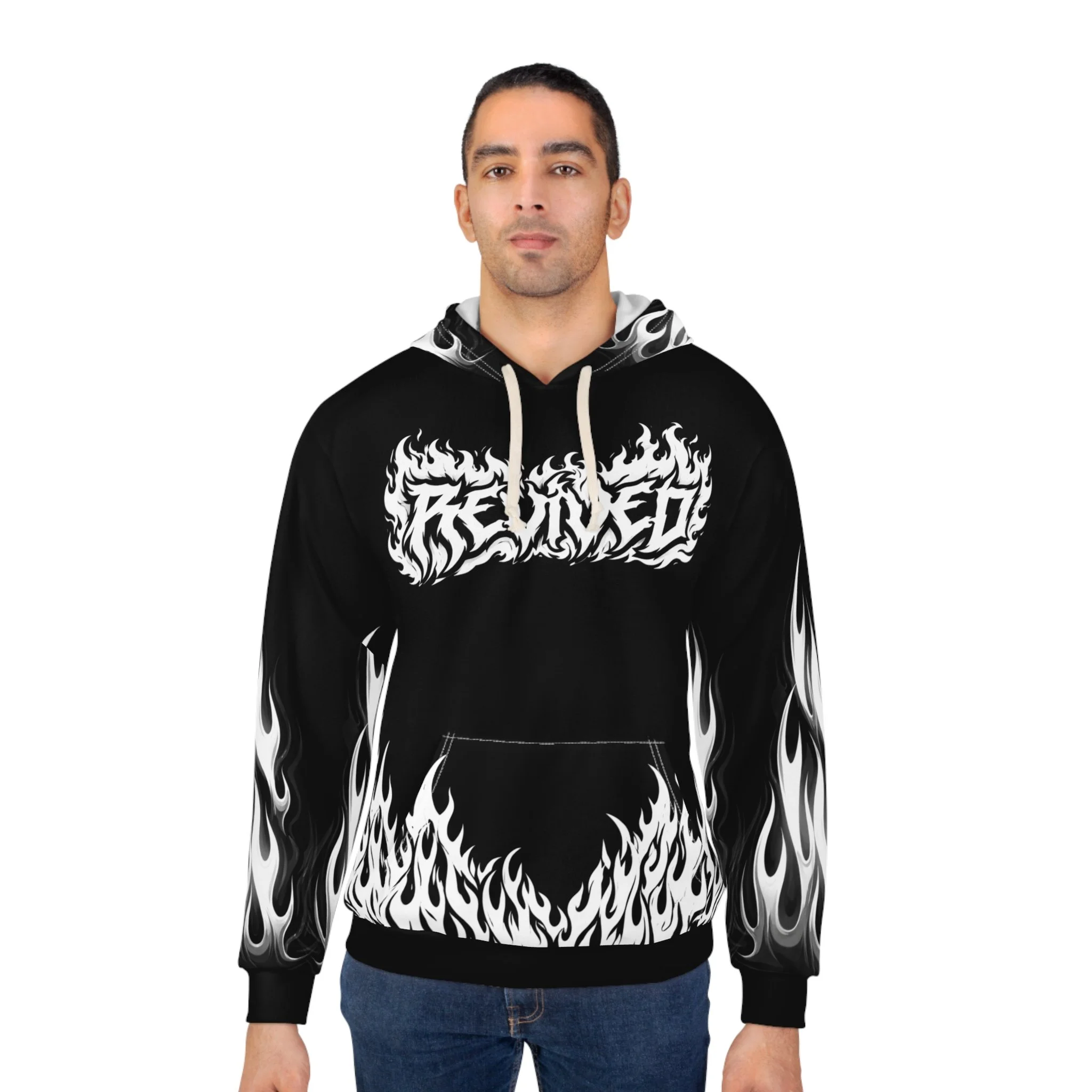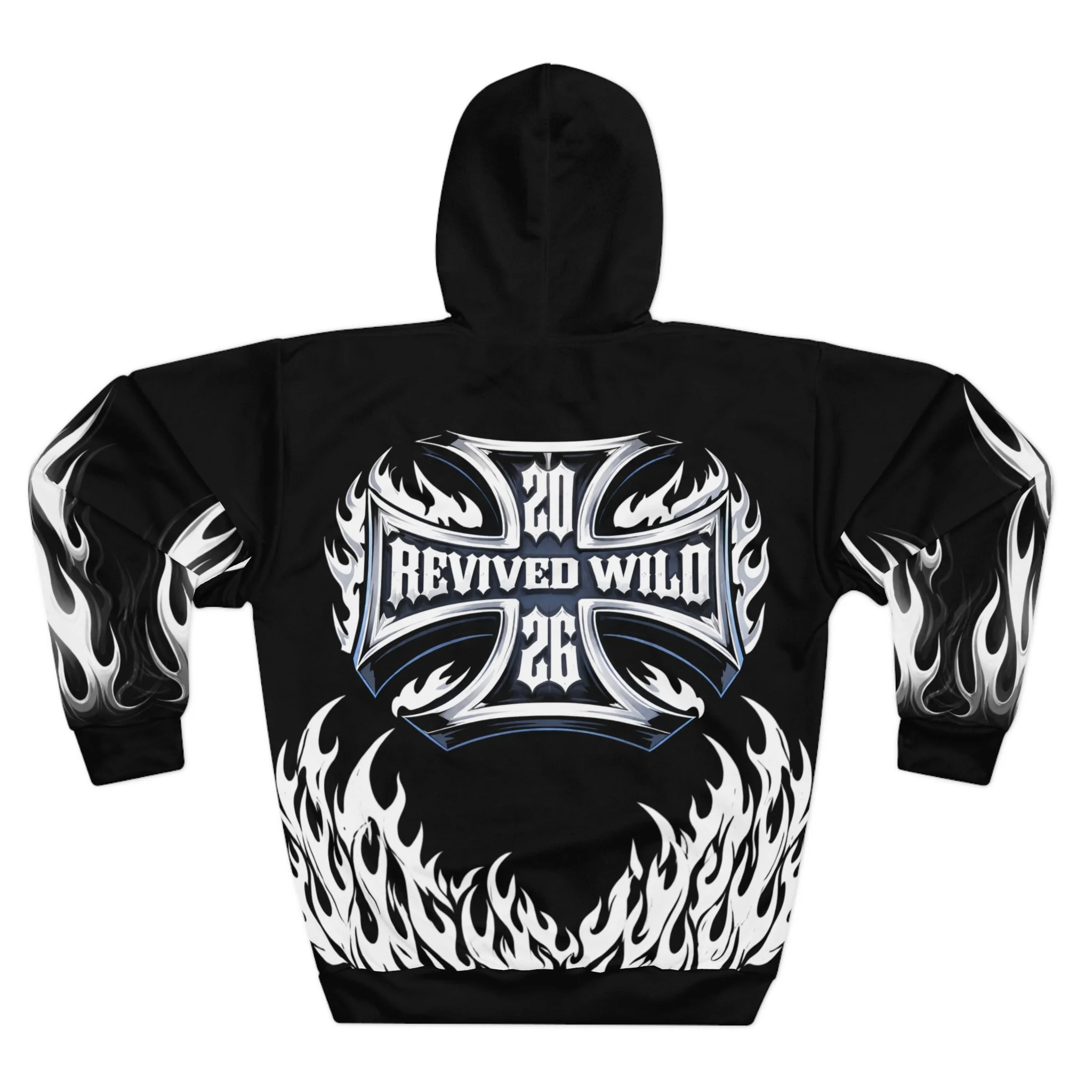 This hoodie channels raw energy and night-street attitude. Heavy black fabric serves as the backdrop for white, tattoo-style flames licking the hem and sleeves, while a distressed, gothic wordmark sits across the chest. The back carries a bold iron-cross motif with stylized lettering, giving the piece an underground, biker-meets-metal vibe. Wear it when you want to bring heat to late rides, show up at underground shows, or layer for chilly nights out with friends. The roomy kangaroo pocket and adjustable hood keep it practical; the all-over print keeps it loud. It feels lived-in from the first pull-over — familiar, fierce, and ready to become part of your nightly rotation.