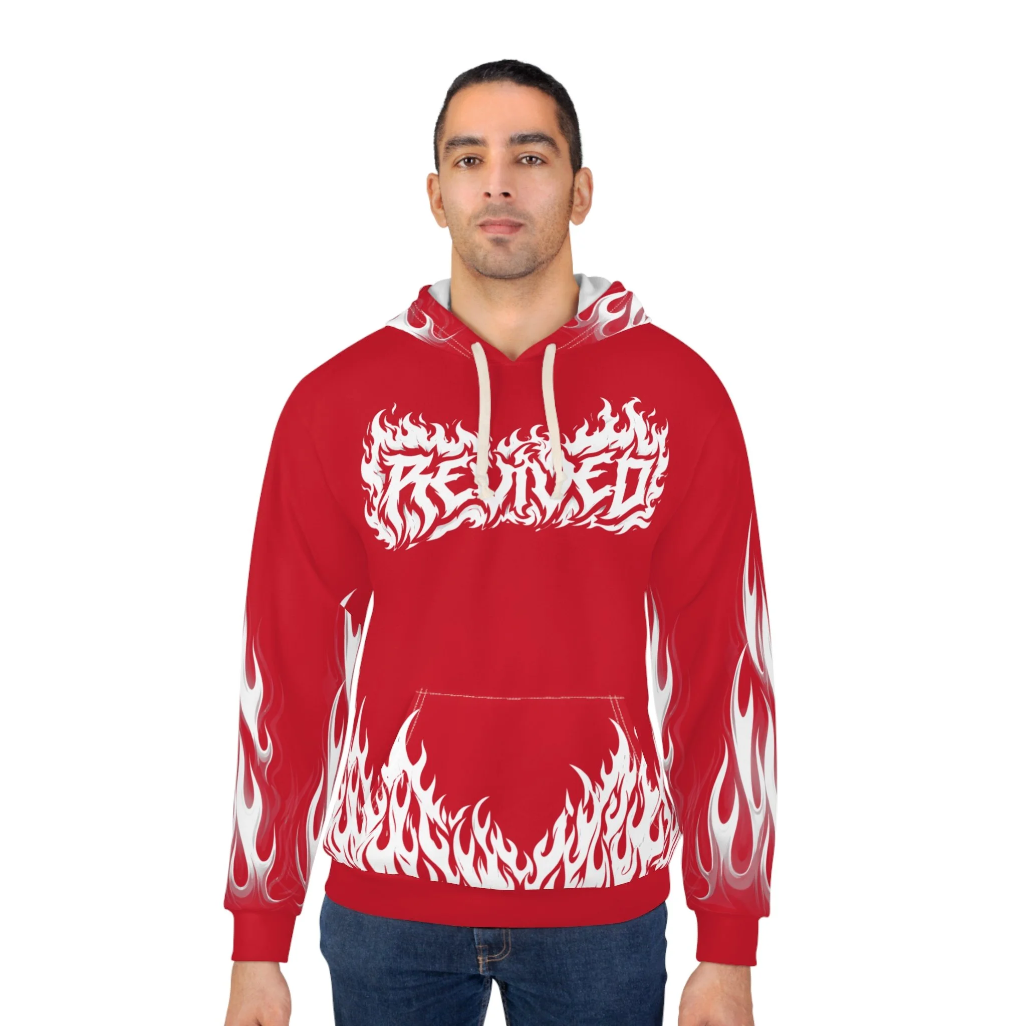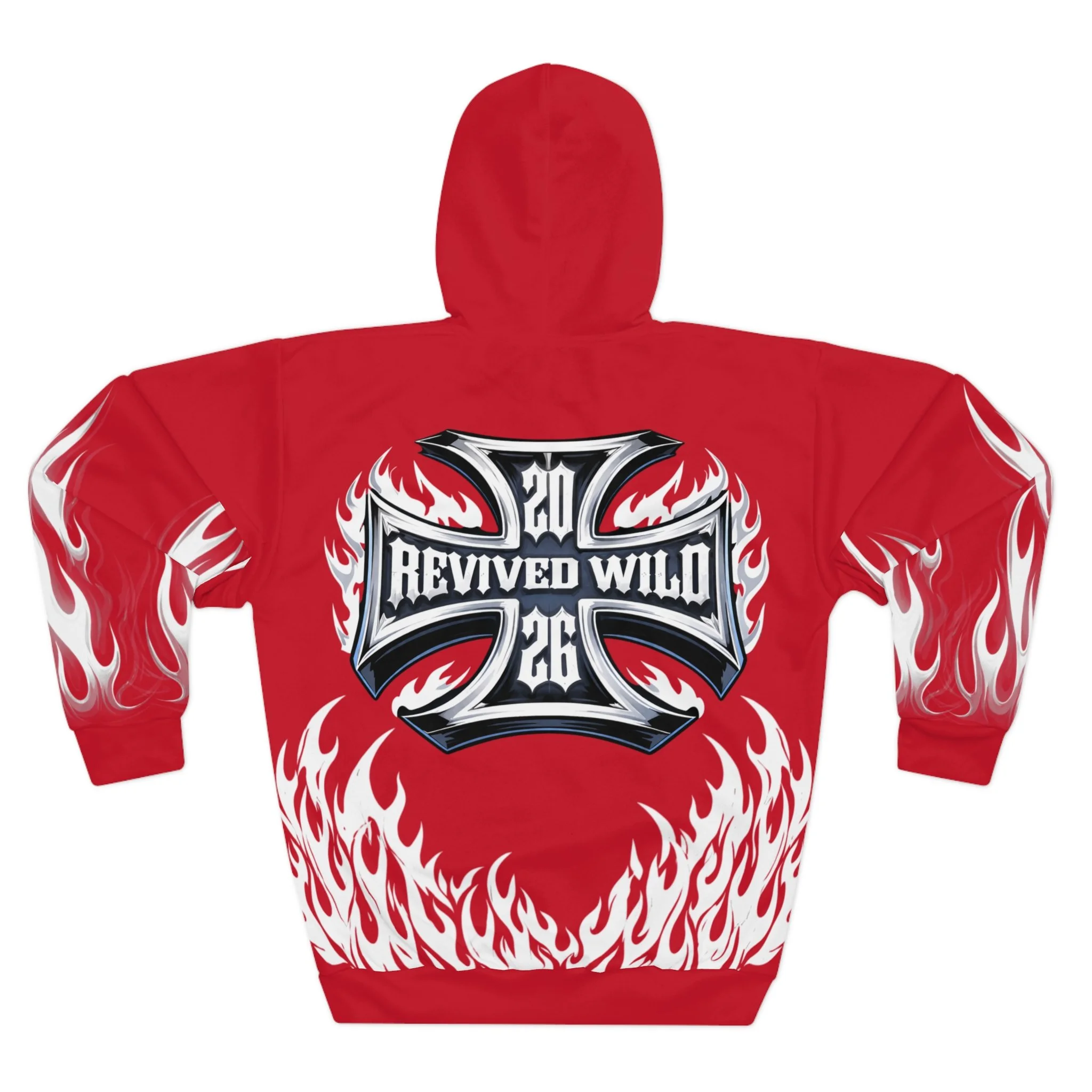 This hoodie channels raw energy and night-street attitude. Heavy black fabric serves as the backdrop for white, tattoo-style flames licking the hem and sleeves, while a distressed, gothic wordmark sits across the chest. The back carries a bold iron-cross motif with stylized lettering, giving the piece an underground, biker-meets-metal vibe. Wear it when you want to bring heat to late rides, show up at underground shows, or layer for chilly nights out with friends. The roomy kangaroo pocket and adjustable hood keep it practical; the all-over print keeps it loud. It feels lived-in from the first pull-over — familiar, fierce, and ready to become part of your nightly rotation.