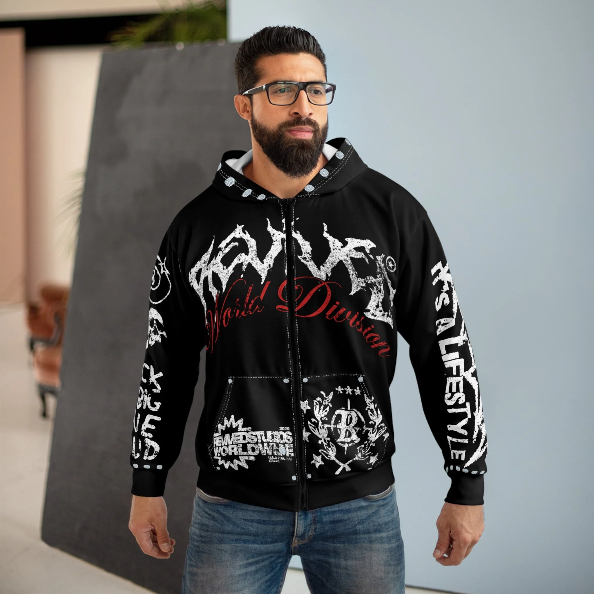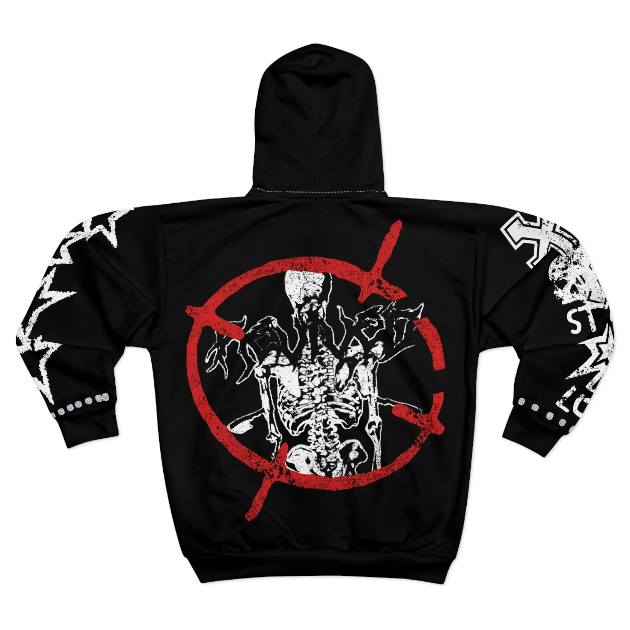 Product features - All-over print with bold black, white, and red skeleton/graffiti artwork - Durable 100% polyester medium-weight fabric (7.4 oz/yd²) - Full-length black zipper with roomy double front pockets - Custom cut-and-sewn construction assembled in the USA - Classic fit with reinforced stitching and white thread detailing