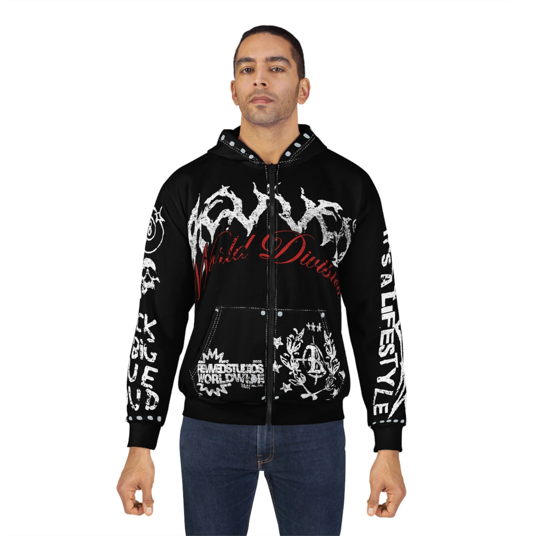 This all-over print zip hoodie brings a raw, underground energy to your daily rotation. Heavy black canvas is covered in distressed white graphics and blood-red accents — skulls, skeletal figures, and graffiti-style logos collide across the chest, sleeves, and back for a lived-in, just-raised-from-the-basement look. The full-coverage print keeps the visuals vivid and uninterrupted while the roomy front pockets and medium-weight fabric make it wearable year-round. It wears like the jacket you reach for when you want to stand out without saying much: loud art, gritty attitude, and a rugged, DIY vibe that fits into shows, late-night hangouts, and days when you need to channel something fierce.